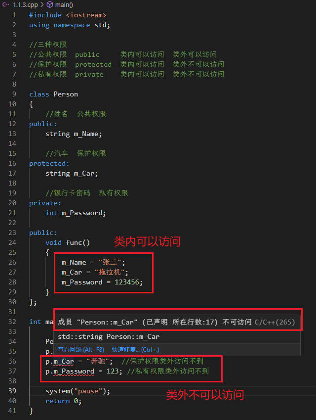 1 2 3 4 5 6 7 8 9 10 11 12 13 14 15 16 17 18 19 20 21 22 23 24 25 26 27 28 29 30 31 32 33 34 35 36 37 38 39 40 41 #include <iostream> using namespace std;class Person { public : string m_Name; protected : string m_Car; private : int m_Password; public : void func () { m_Name = "张三" ; m_Car = "拖拉机" ; m_Password = 123456 ; } }; int main () { Person p; p.m_Name = "李四" ; system ("pause" ); return 0 ; }