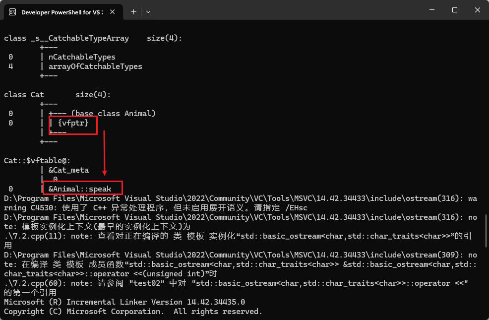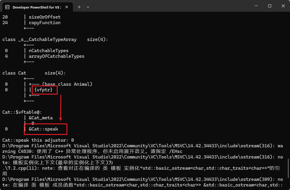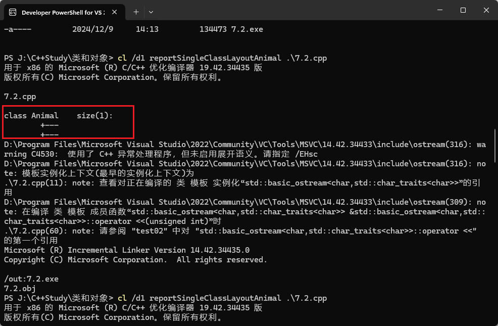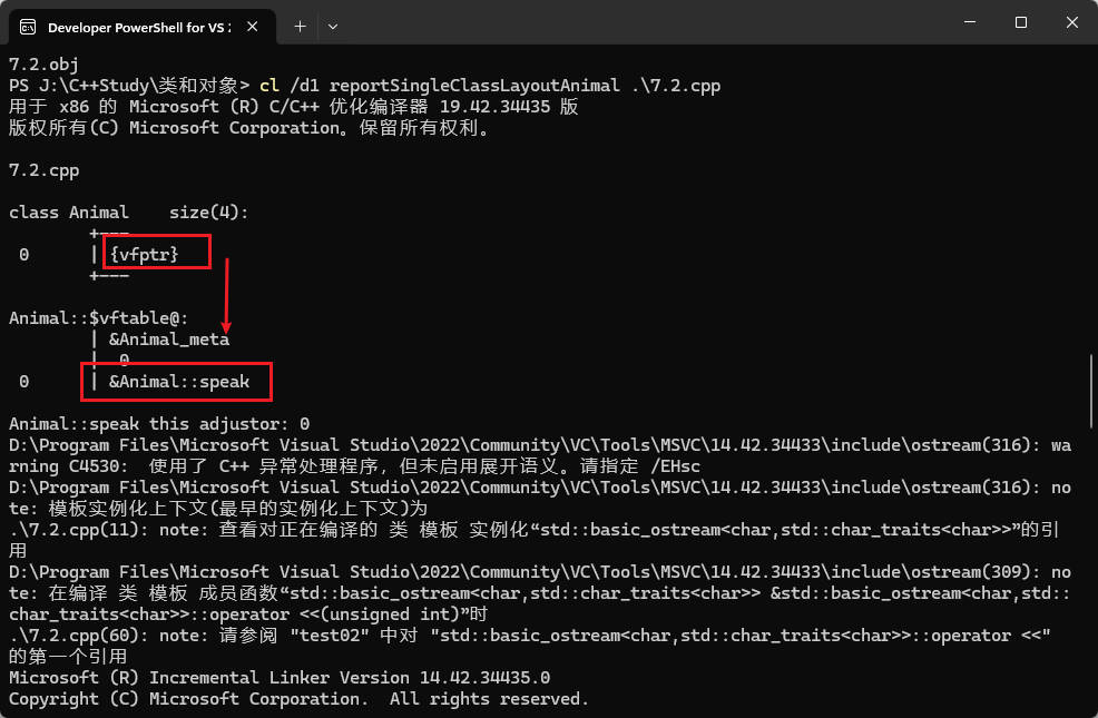 7.2 多态的原理剖析 在Animal类中,如果不使用virtual关键字让speak()函数作为虚函数的话,此时该类的结构如图,空类大小为1。