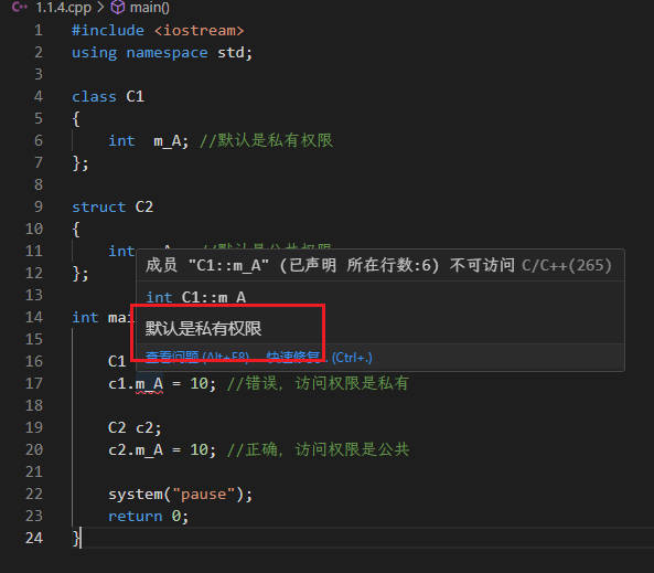 1 2 3 4 5 6 7 8 9 10 11 12 13 14 15 16 17 18 19 20 21 22 23 24 #include <iostream> using namespace std;class C1 { int m_A; }; struct C2 { int m_A; }; int main () { C1 c1; c1.m_A = 10 ; C2 c2; c2.m_A = 10 ; system ("pause" ); return 0 ; }