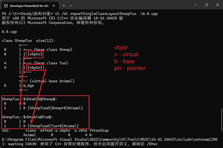 在使用虚继承之后,如图所示,相同变量使用vbptr(虚基类指针)表示,该指针指向vbtable(虚基类表)。表中记录了变量的偏移量。两个子类中的vbptr均指向了相同的变量,因此该数据只有一个。