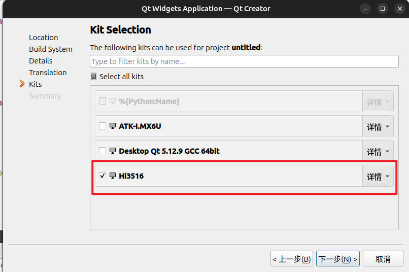 (1)在ubuntu中,打开QT软件,创建一个程序。创建时Kits选择之前新建的Hi3516套件。