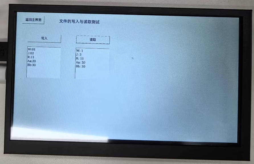程序功能是操作在开发板/opt/文件夹下的Test.ini文件,按下写入按钮,程序向文件写入屏幕左侧textedit中的内容,按下读取按钮,程序读取文件,并将内容写入屏幕右侧textedit。