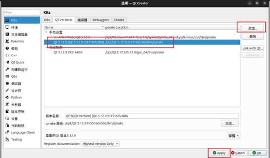 最后,添加构建套件,选择刚才设置的Qt Version、编译器。