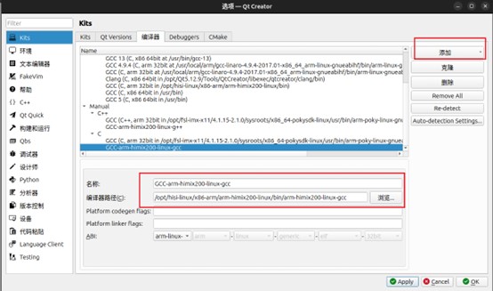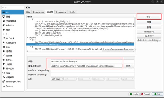 启动QtCreator,打开“工具——>选项——>Kits”构建套件设置页面。